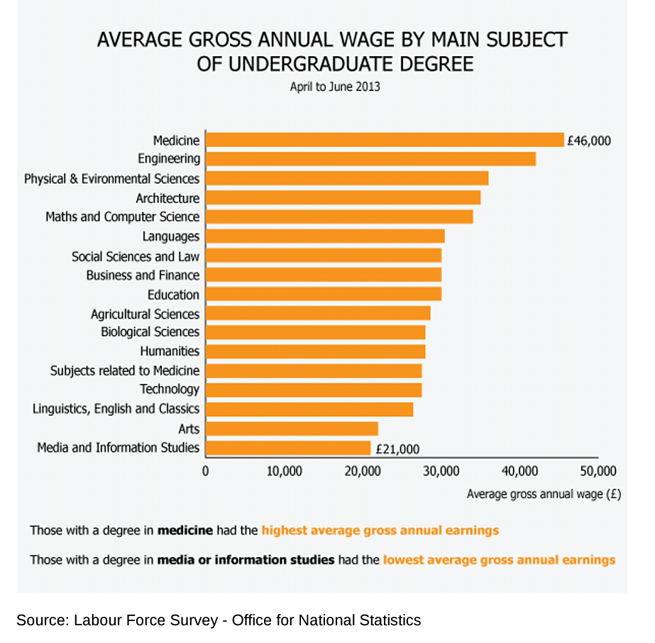So does this wonderful news mean that you should now study arts degrees? Well, if you’re in it for the money, then no. Wages for arts graduates are the second lowest, just behind Humanities degrees at 21K per annum compared to 45K for Medical graduates. Study for an Arts degree and you are likely to be comparatively low-paid!