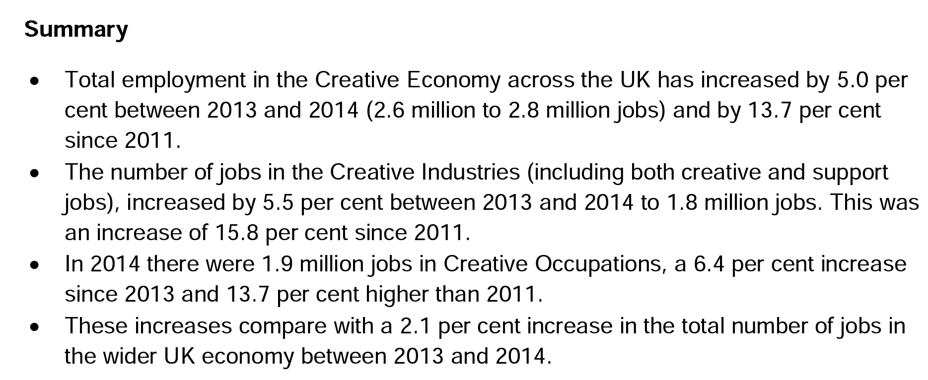 Well, there’s some great news! The number of jobs in the Creative Industries increased by 5.5 per cent between 2013 and 2014 to 1.8 million jobs. This was an increase of 15.8 per cent since 2011.