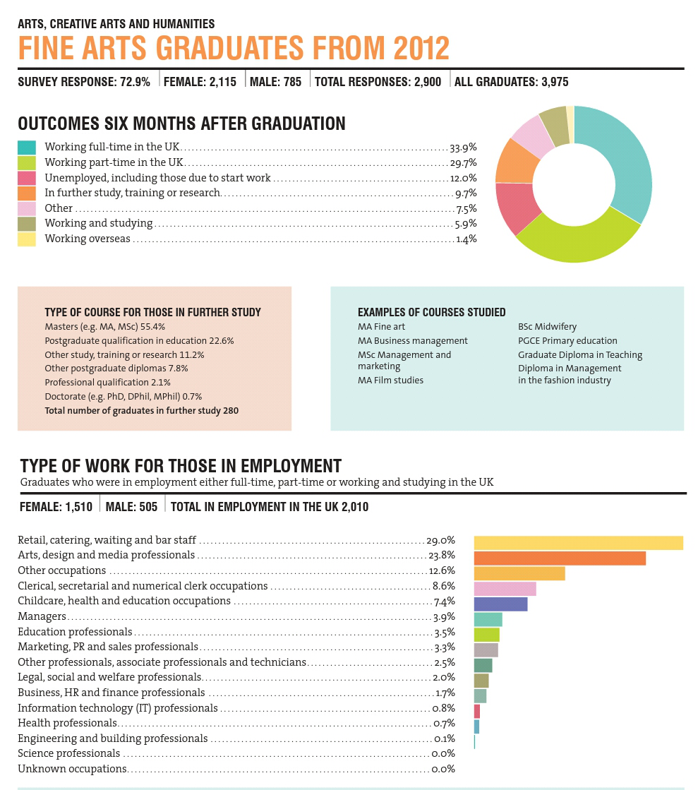 So the chances of you ending up in your dream career are heavily stacked against you; only one in four fine art graduates will find work in their chosen profession and just over one in three design graduates. Of course this data illustrates employment for graduates only and does not account for what happens after six months. Nor have all graduates been surveyed, but the data spread used is secure enough to give a strong indication of employment trends.