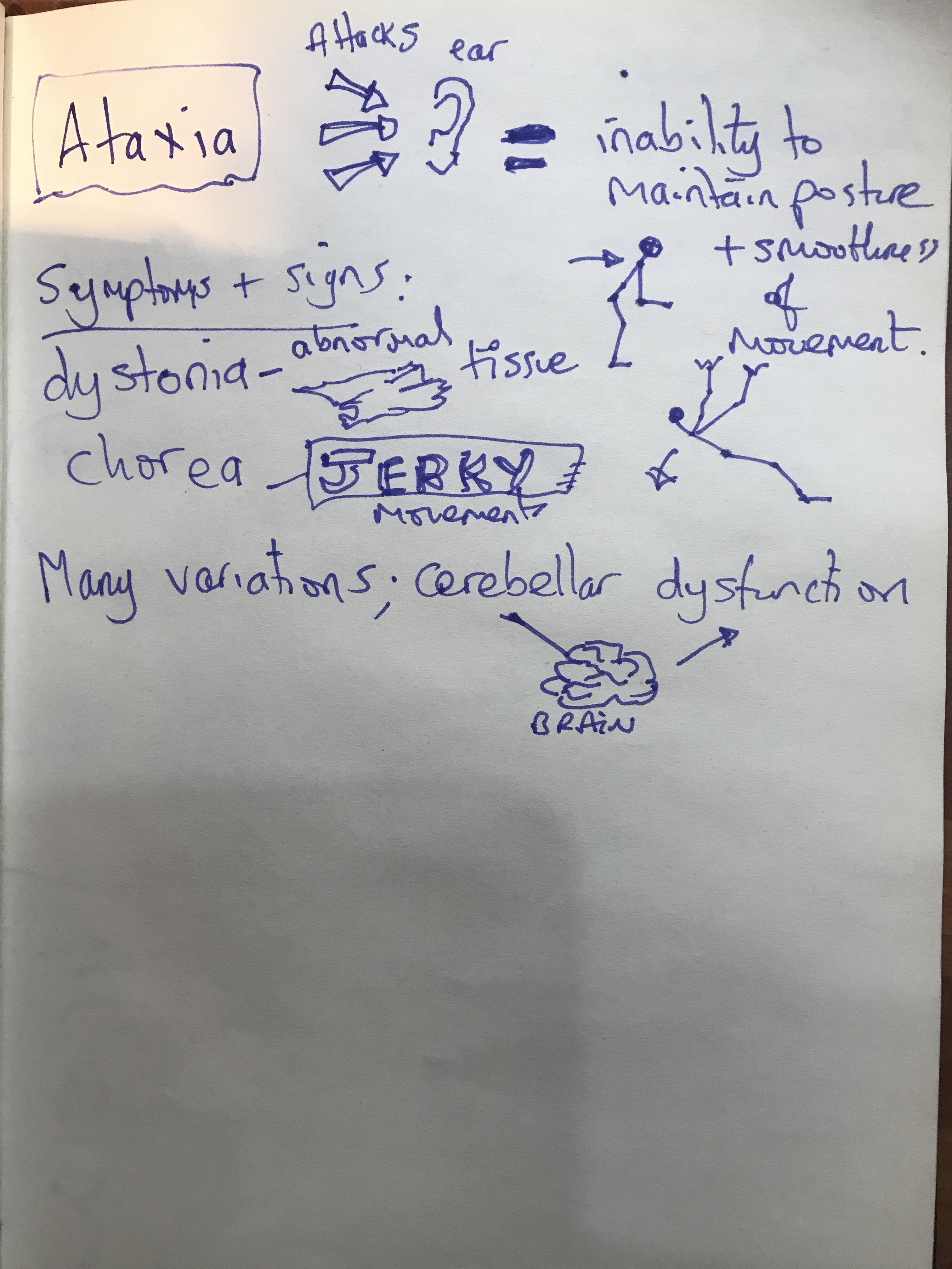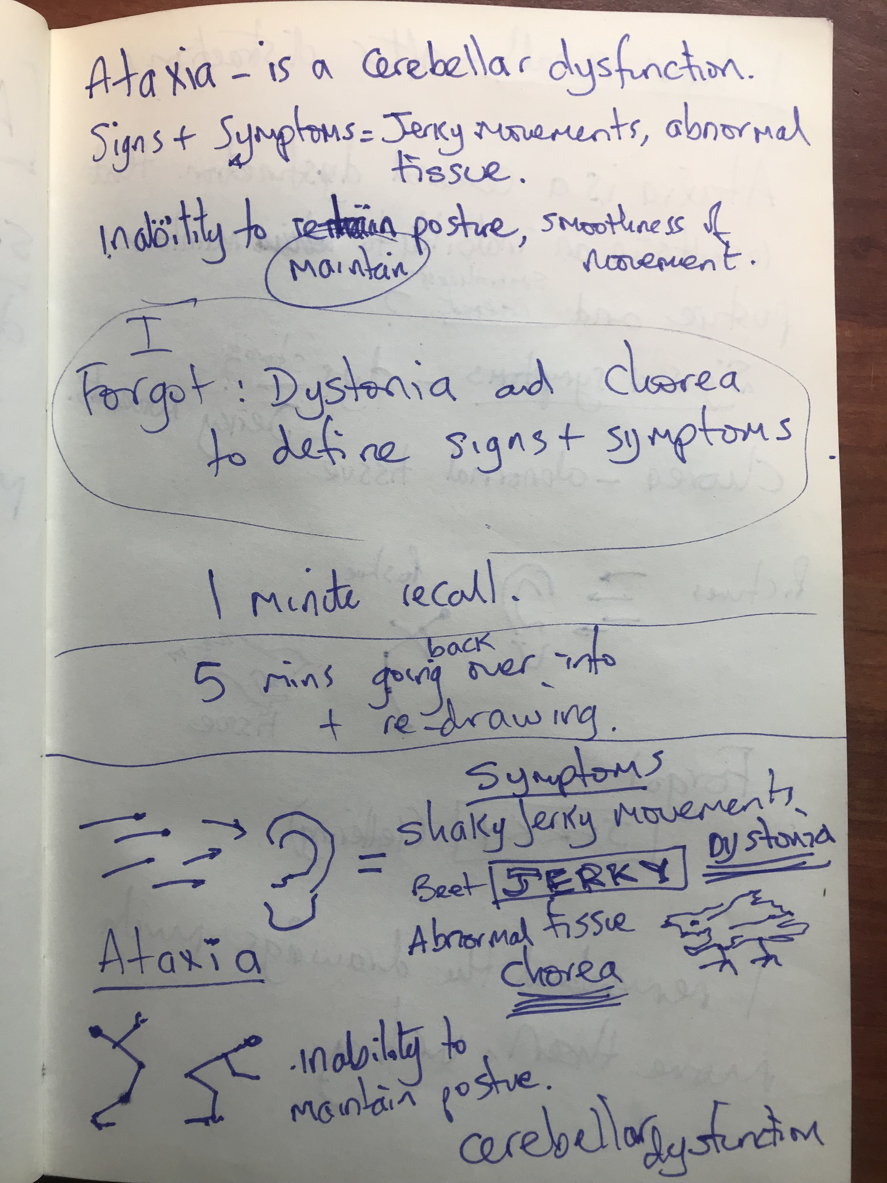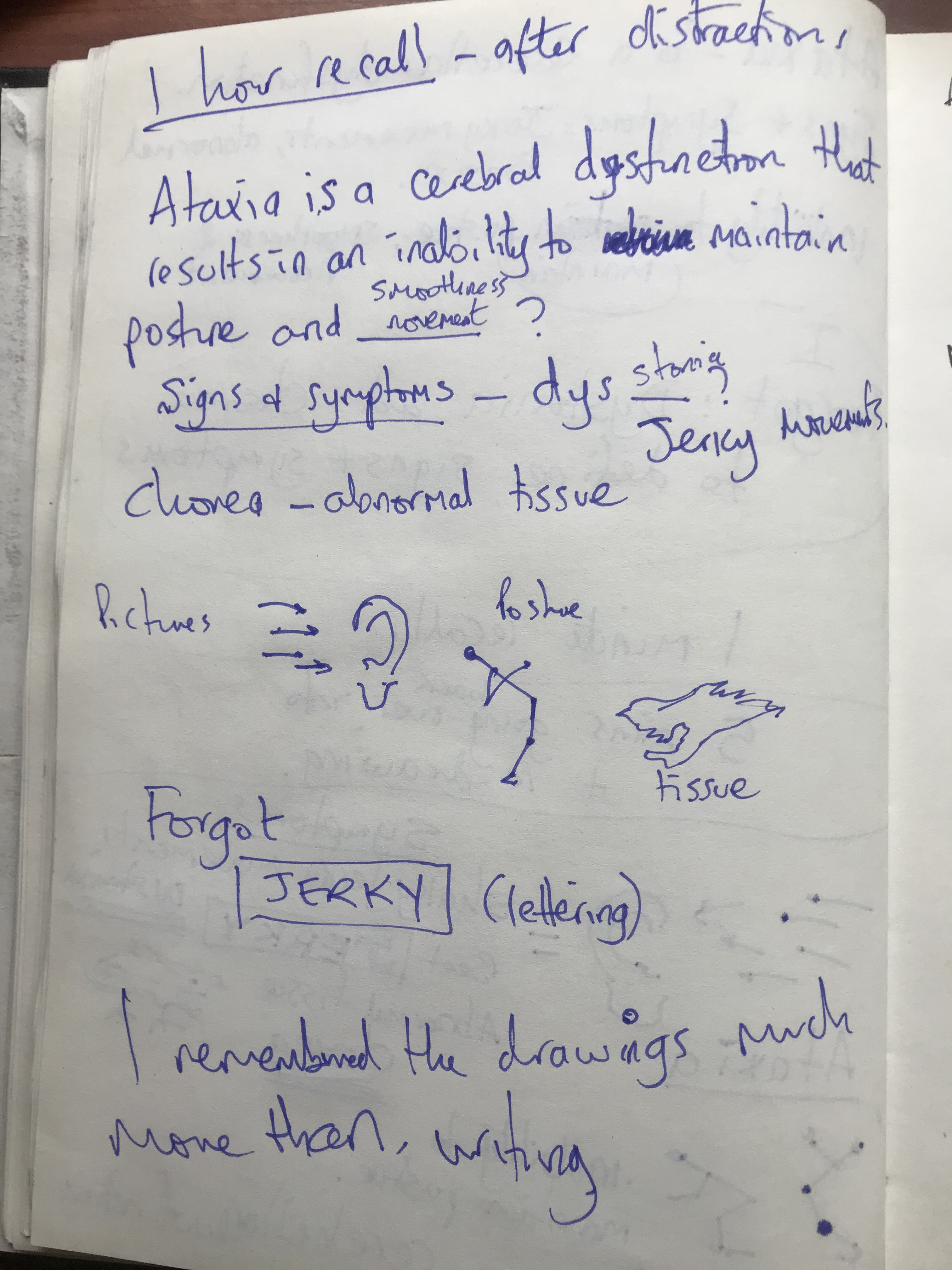 Finally, after one hour I tested myself again and found I could easily remember the main term Ataxia and define its symptoms, but I struggled to recall the two symptoms Dystonia and Chorea. what is interesting is that I remembered the information I had drawn pictures for much more easily than that that I had merely written, supporting the research claims.