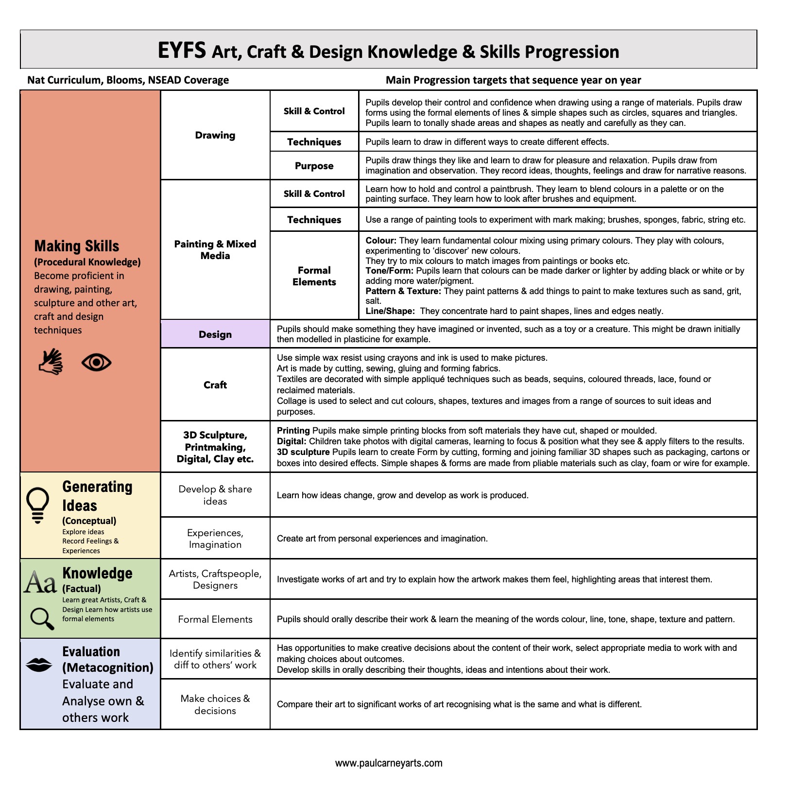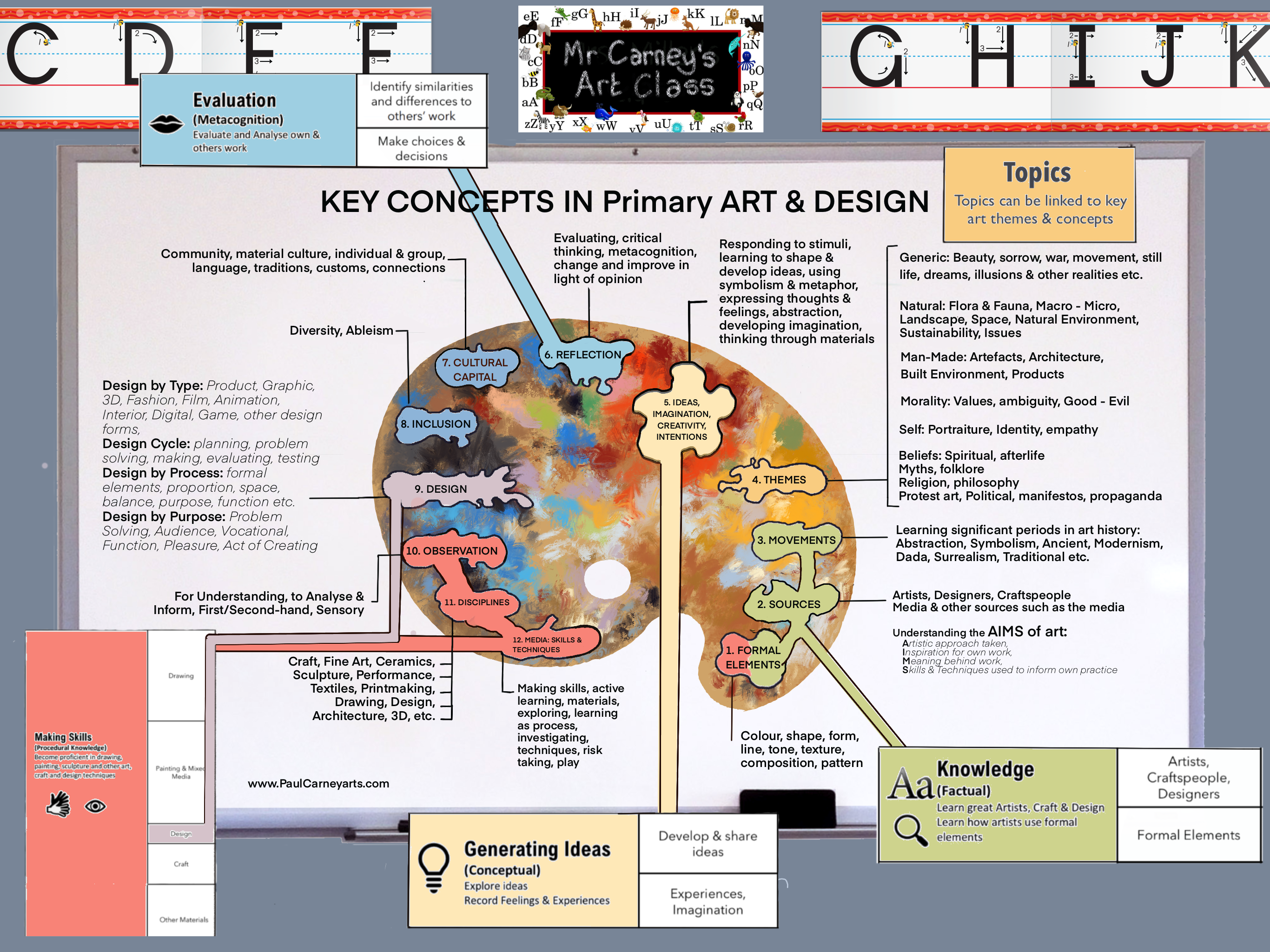 My key concepts are; formal elements in both theory and practice, choice of media, design, making & craft, knowledge of artists’ intentions and art movements, creativity, inclusion, reflection, diversity, observation and themes in art. For a more detailed description of Key Concepts, visit www.paulcarneyarts.com