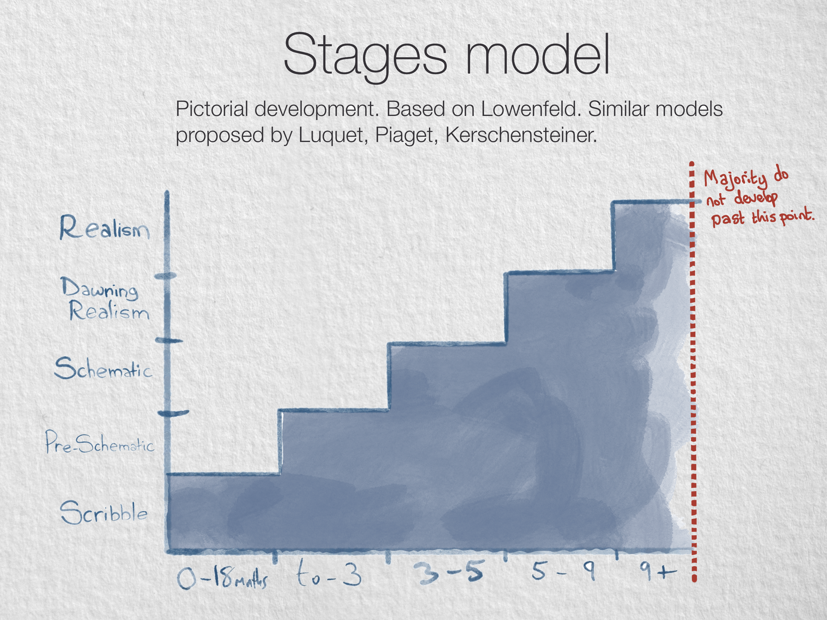 Pictorial development – the Stages model In the first half of the 20th Century, children’s drawings were studied for their illumination of the development of the minds of children, from a ‘primitive’ state to intellectual enlightenment. Many studies were undertaken by psychologists and thinkers such as John Dewey, Kerschensteiner, Luquet, Lowenfeld and Piaget.