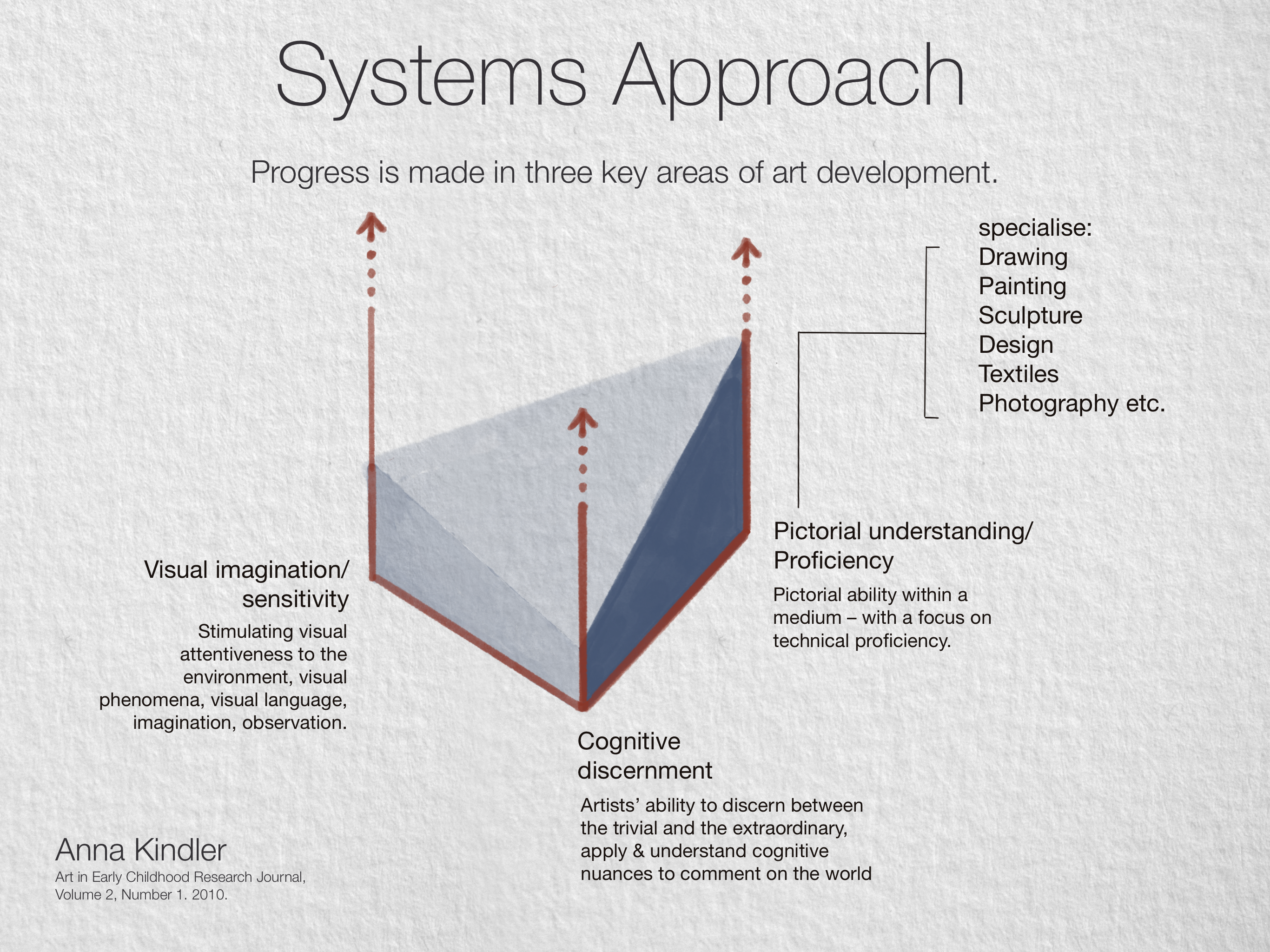 Kindler’s systems model In the 1990’s and 2000’s, Professor Anna Kindler proposed an alternative theory of artistic development based on a systems approach that recognizes the dynamic interplay between the three key variables: the individual, the educational field and the domain, in conceptualizing artistic growth.