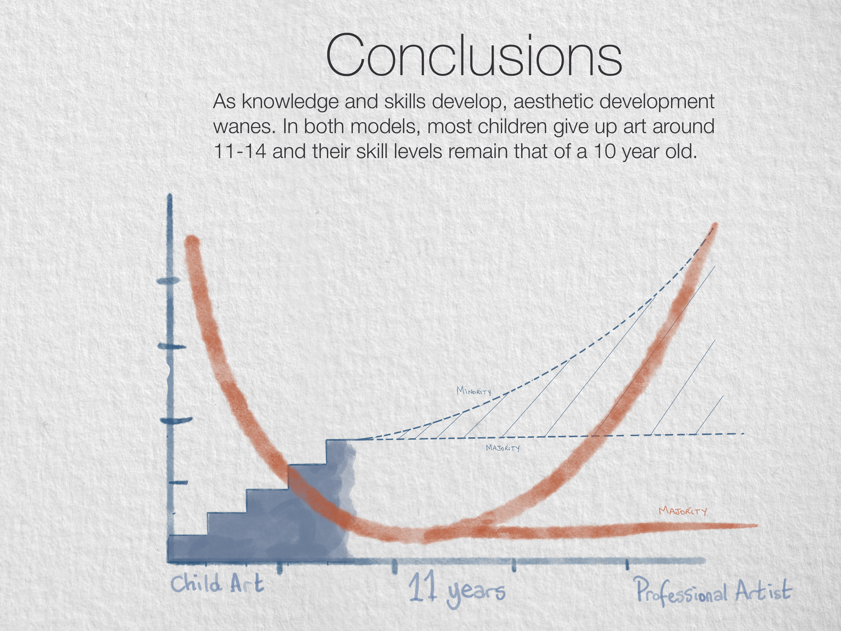 What she discovered was that aesthetic aspects of art progressed in a U-curve, where children aged around 5 years had high levels of aesthetic attainment, similar to those of professional artists. They also found that attainment dipped considerably until the age of eleven, where it plateaued for most, but accelerated for a talented minority who gained greater artistic capacity. The U-curve model argues that artistic development does not proceed in a linear fashion and it does not necessarily involve improvement over time.
