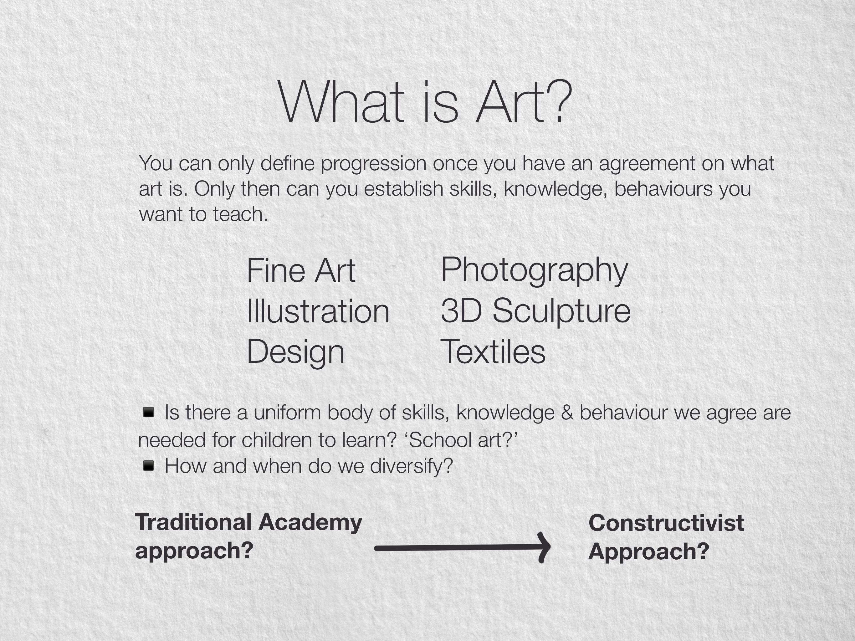 Professor Anna M. Kindler’s work in the 1990’s and 2000’s on artistic development in children has been extremely influential to me. I won’t try to summarise all her extensive research, but she states that you cannot define progression in art until you answer the question ‘what is art?’ This is not an easy question to answer but she outlines several education-based definitions of art: