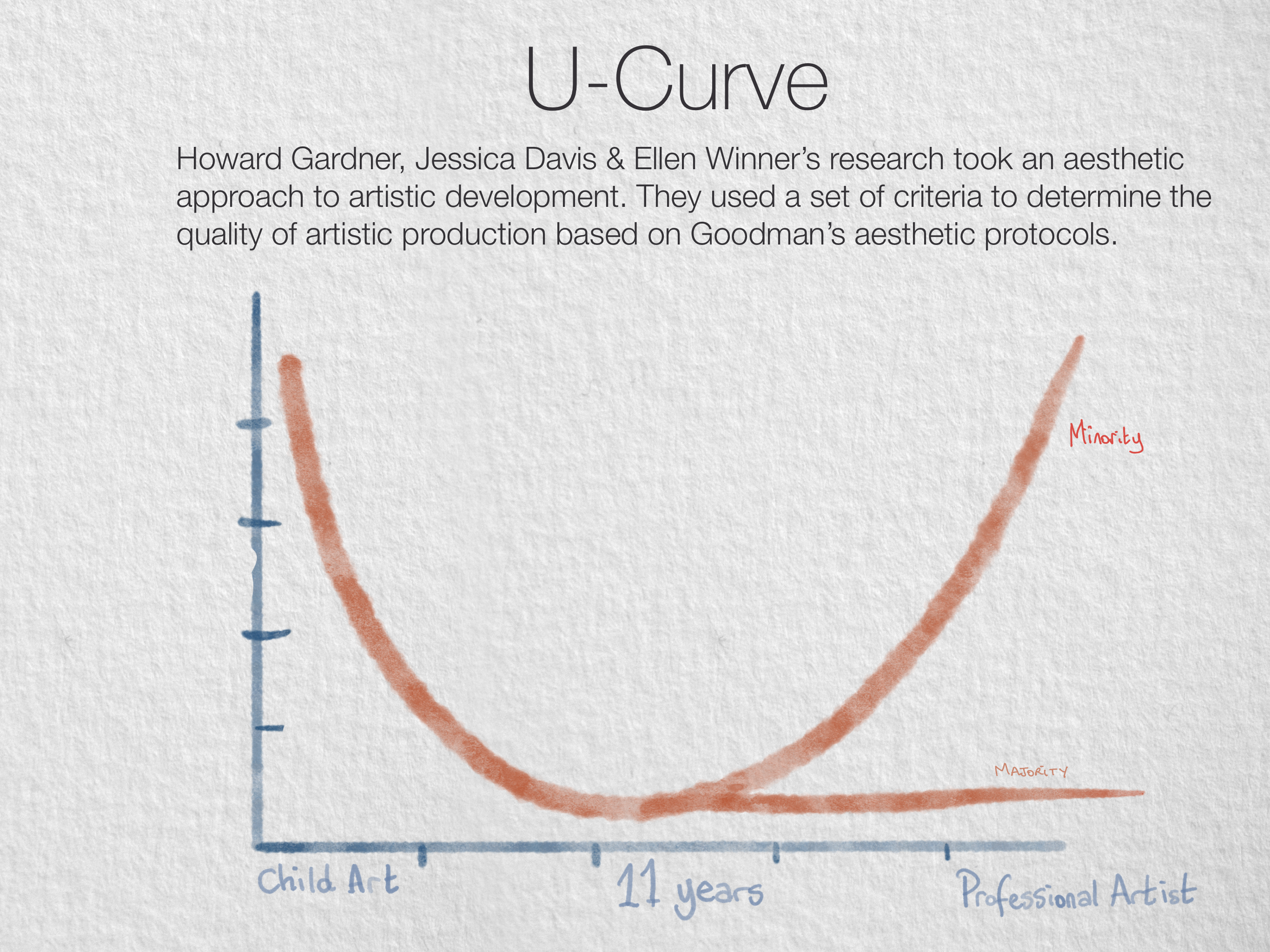 U-curve model In the 90’s, Howard Gardner, Jessica Davis & Ellen Winner took a more aesthetic approach to artistic development. They used a set of criteria to determine the quality of artistic production of self-portraits that were assessed by expert judges based on Goodman’s aesthetic protocol. (Goodman, 1968). This protocol very clearly reflected an aesthetic value system corresponding to the modernist artistic heritage and related pictorial development to symbolic systems.