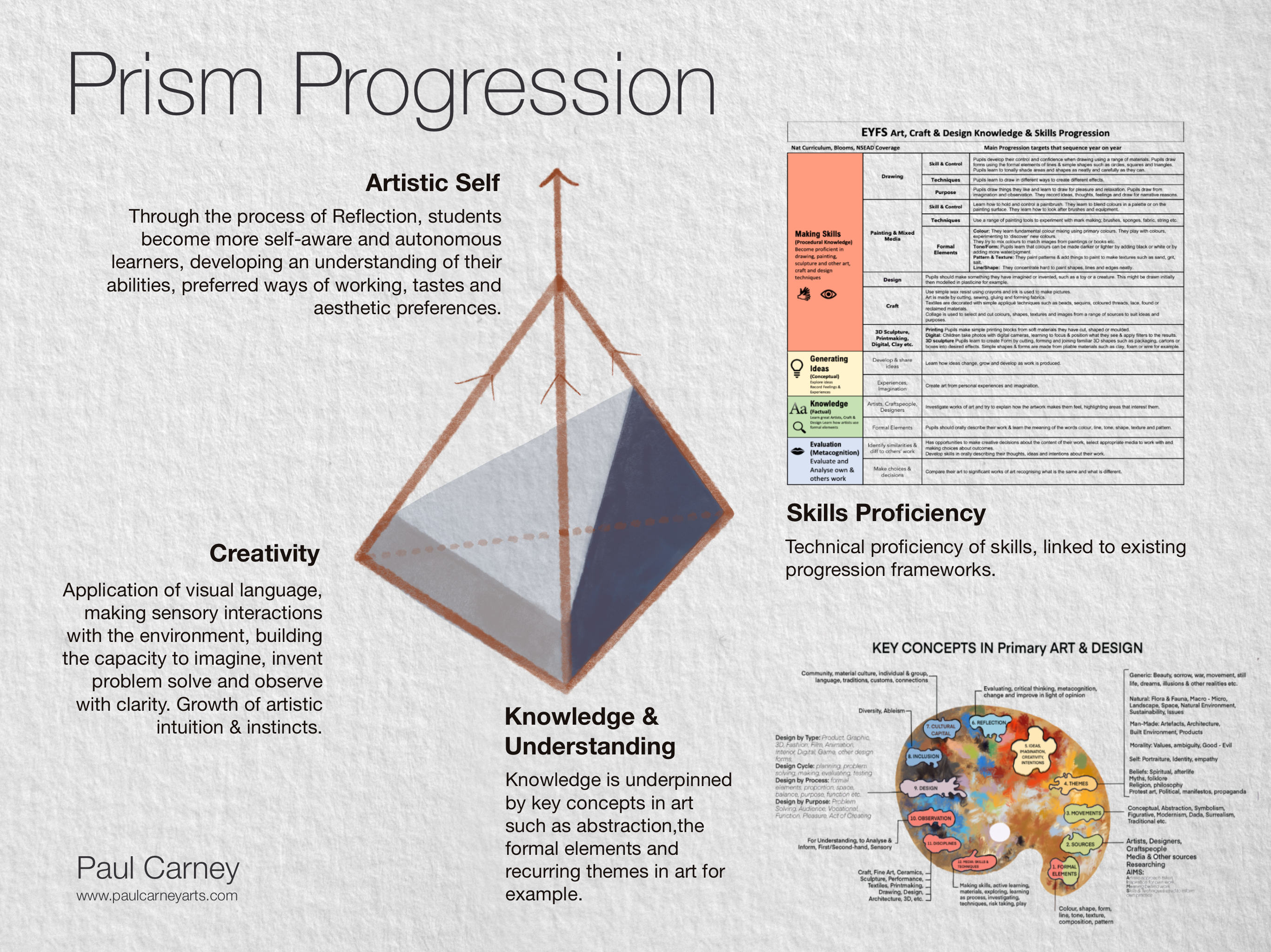 Artistic Self In my Prism model a fourth area for art progression would involve a focus for the development of the artistic self. Being self-aware, children would be able to articulate their likes and dislikes, tastes & preferences, in addition to exercising control and autonomy in the creative directions they wish to take, under guidance from the teacher. The three attainment areas of skills proficiency, conceptual knowledge & understanding and expression would combine in greater or lesser amounts depending on the educational intentions. It is perfectly plausible to envisage instances where any of these could be taught in isolation, but I think a balance of these in curriculum planning would ensure that art progression provides a breadth of experience.