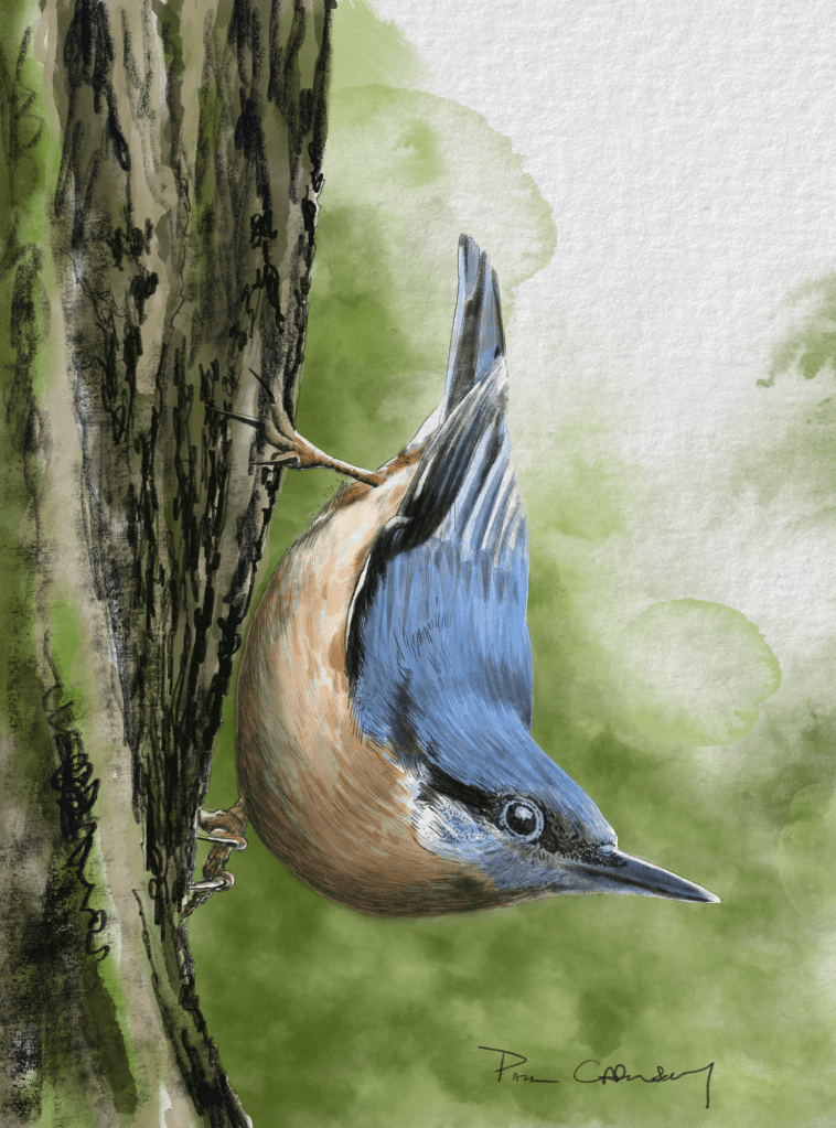 The birds in my garden are a constant source of pleasure for me. I am lucky enough to live near a nature reserve and so get some real beauties visiting me. Here are some birds I’ve drawn or painted. I hope you like them!