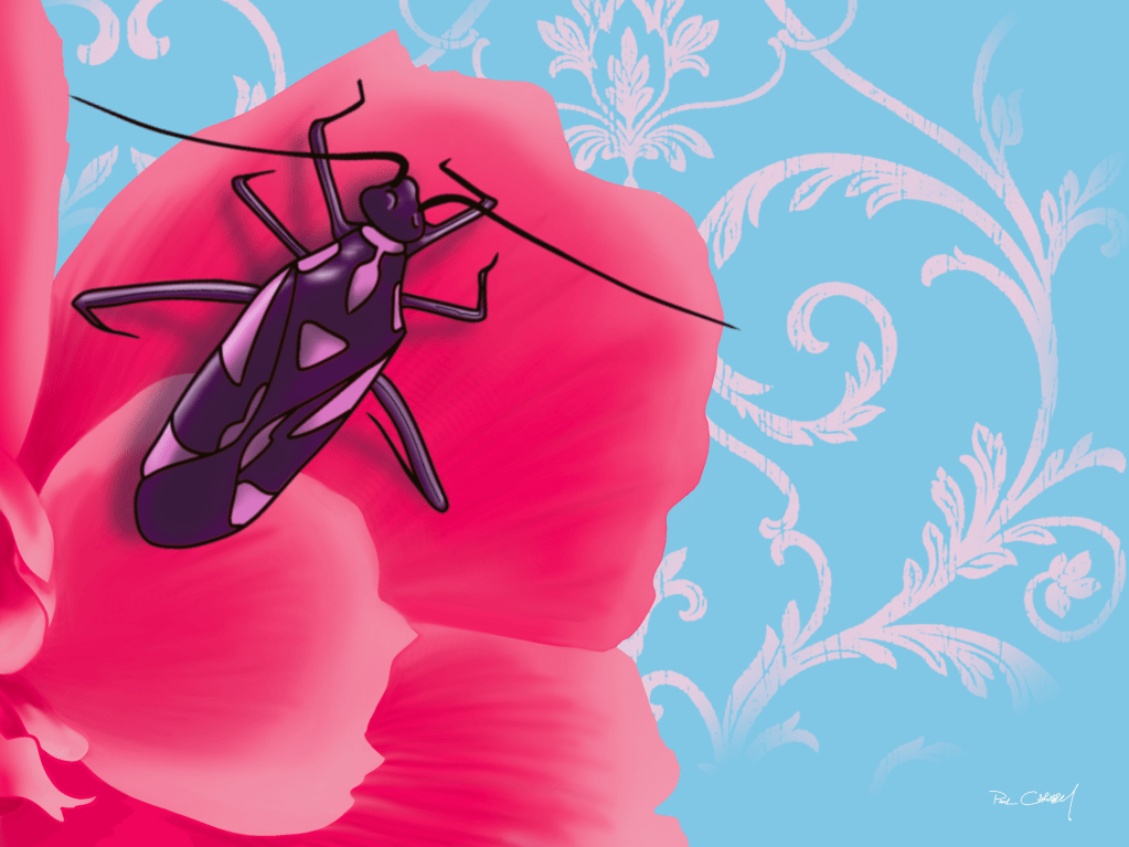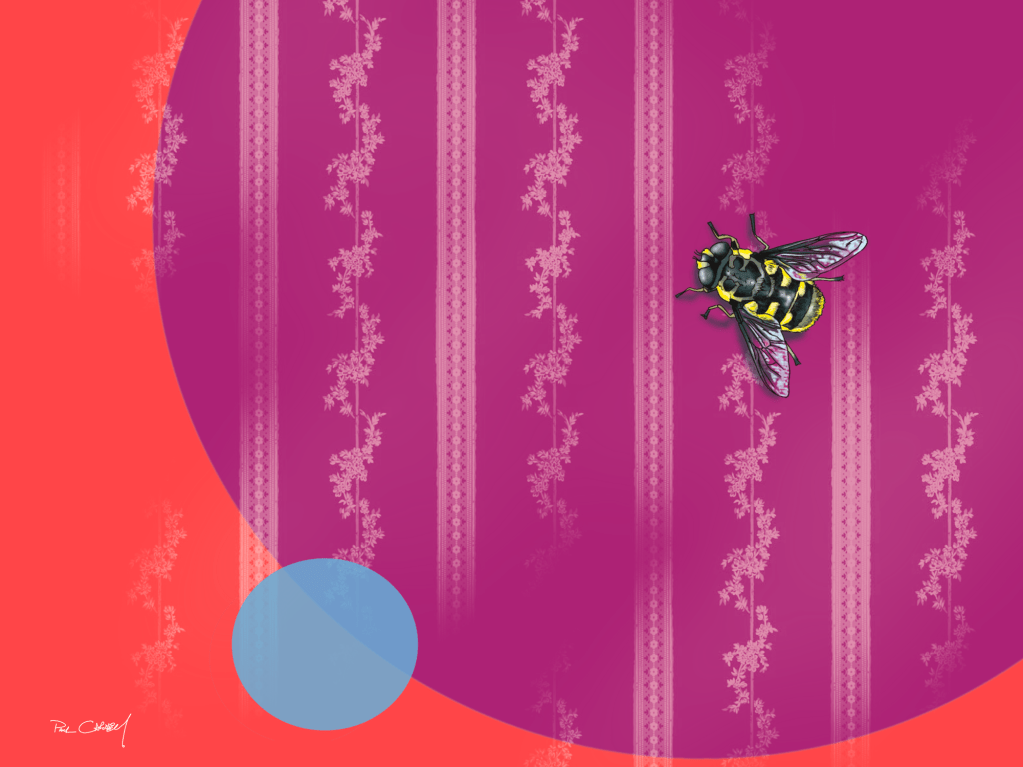 I’ve been inspired by the wonderful insects in my garden this year. So, why not I fuse them into my art? I wanted to weave bright, vibrant colours with wallpaper patterns, comparing and contrasting nature with human design. Here are my latest forays:
