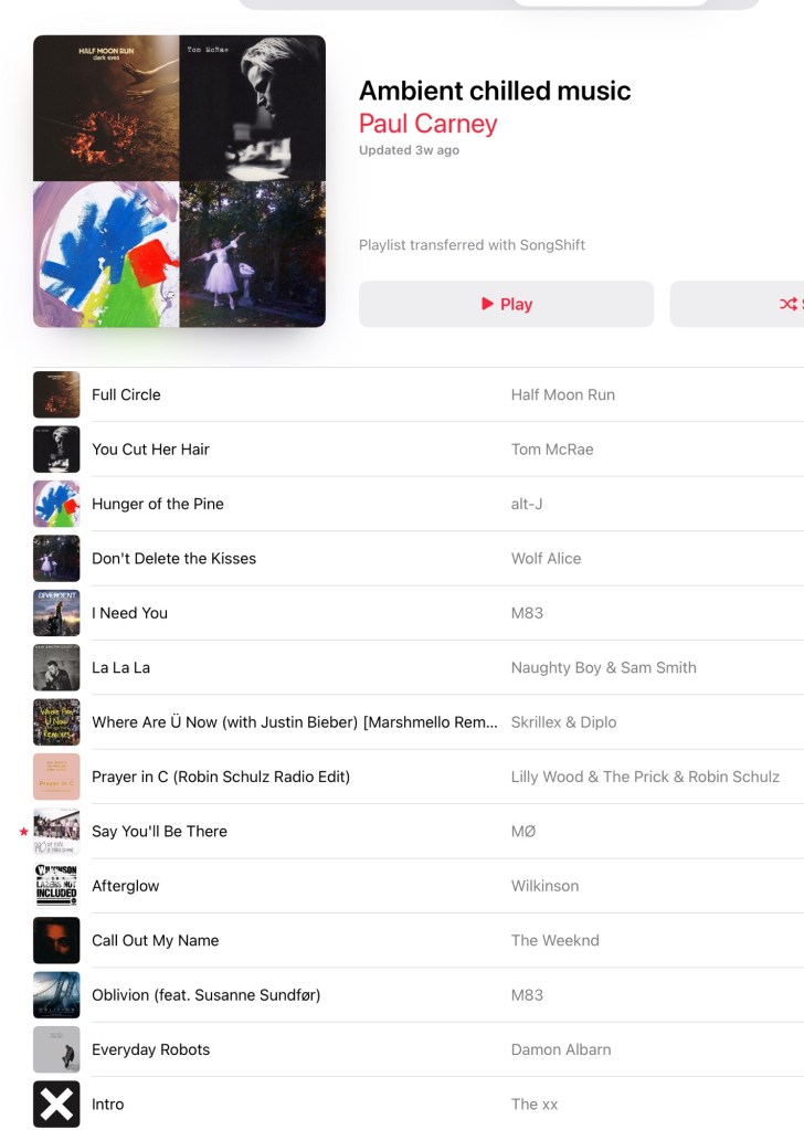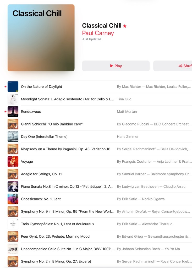 I’ve attached some photos of my music playlists. I spend a long time putting them together. Music has been a huge part of my life. I’ve sung and played instruments since I could first speak. I don’t play live anymore but I do still play at home, and occasionally for friends. These days however, music is in my headphones. It is stuff that relaxes me, or uplifts me, or just makes me feel good. Some of it is old like me, some of it crosses genres, some it is classic, some cheesy, some sing along, some air guitar, some instrumental, some rock and some pop.
