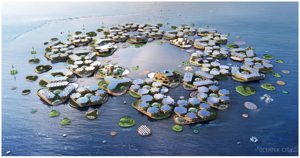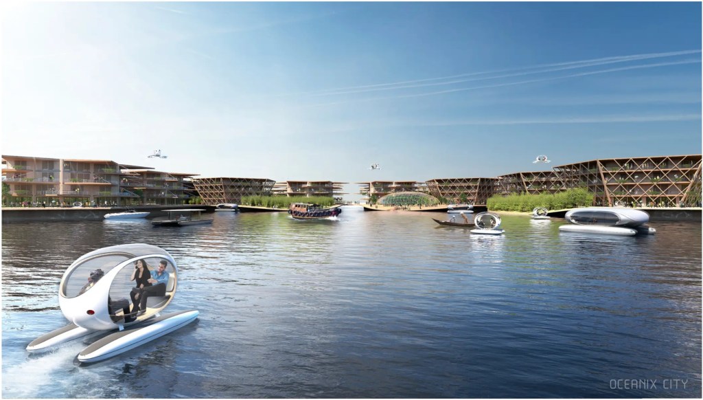 OCEANIX City is designed to grow, transform and adapt organically over time, evolving from neighborhoods to cities with the possibility of scaling indefinitely. Modular neighborhoods of 2 hectares create thriving self-sustaining communities of up to 300 residents with mixed-use space for living, working and gathering during day and nighttime.