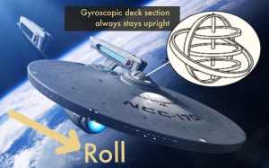 As a huge Star Trek fan, I would be Captain James T. Kirk for the day. I’d lead a mission to go boldly where no one has gone before. When I watch the show, however, there is something that irks me. I’m often struck by the brilliant design of the Starship Enterprise. It’s a beautiful design in my opinion; however, its sleek looks betray a whopping design flaw. Although it possesses artificial gravity onboard, its huge, disc-shaped hull would not be able to overcome other forces of motion such as pitch, rolling, and surge. When it tilts to either side, up or down, everyone would roll with it, as sailors do onboard an ocean ship. There are lots of times you see the Enterprise rolling around in battle, but only minimal disruption occurs to the movement of the crew.